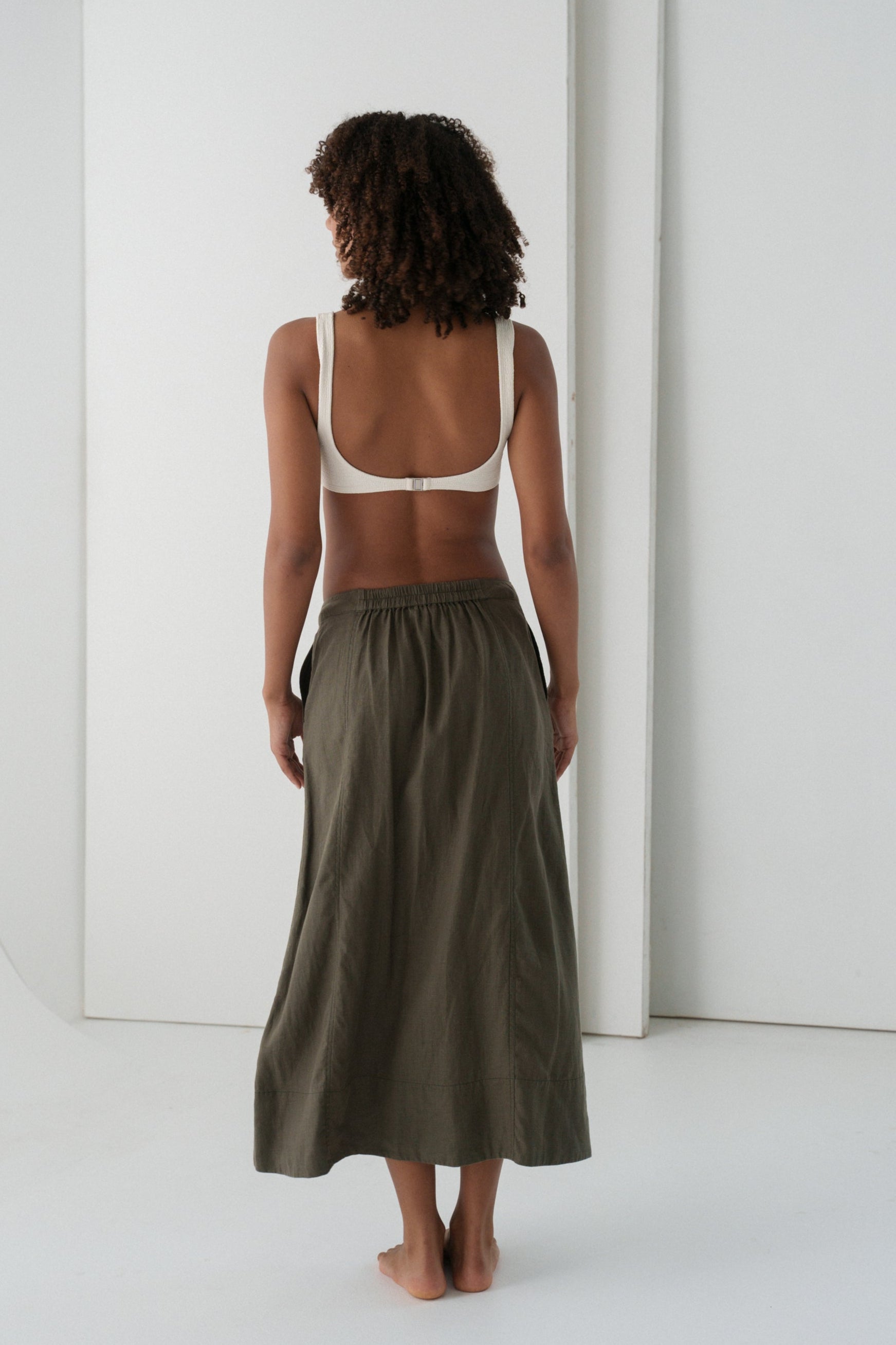 We love the denim skirt look but wanted something much lighter for the warm summer days. So here comes GIA skirt, a denim skirt inspired design, with heavy-stitch seamlines and an easy A-line shape. The elasticated back waist band ensures a perfect fit and comfort. Pair with our MAYA or LOUISA top for an effortless summer ensemble.