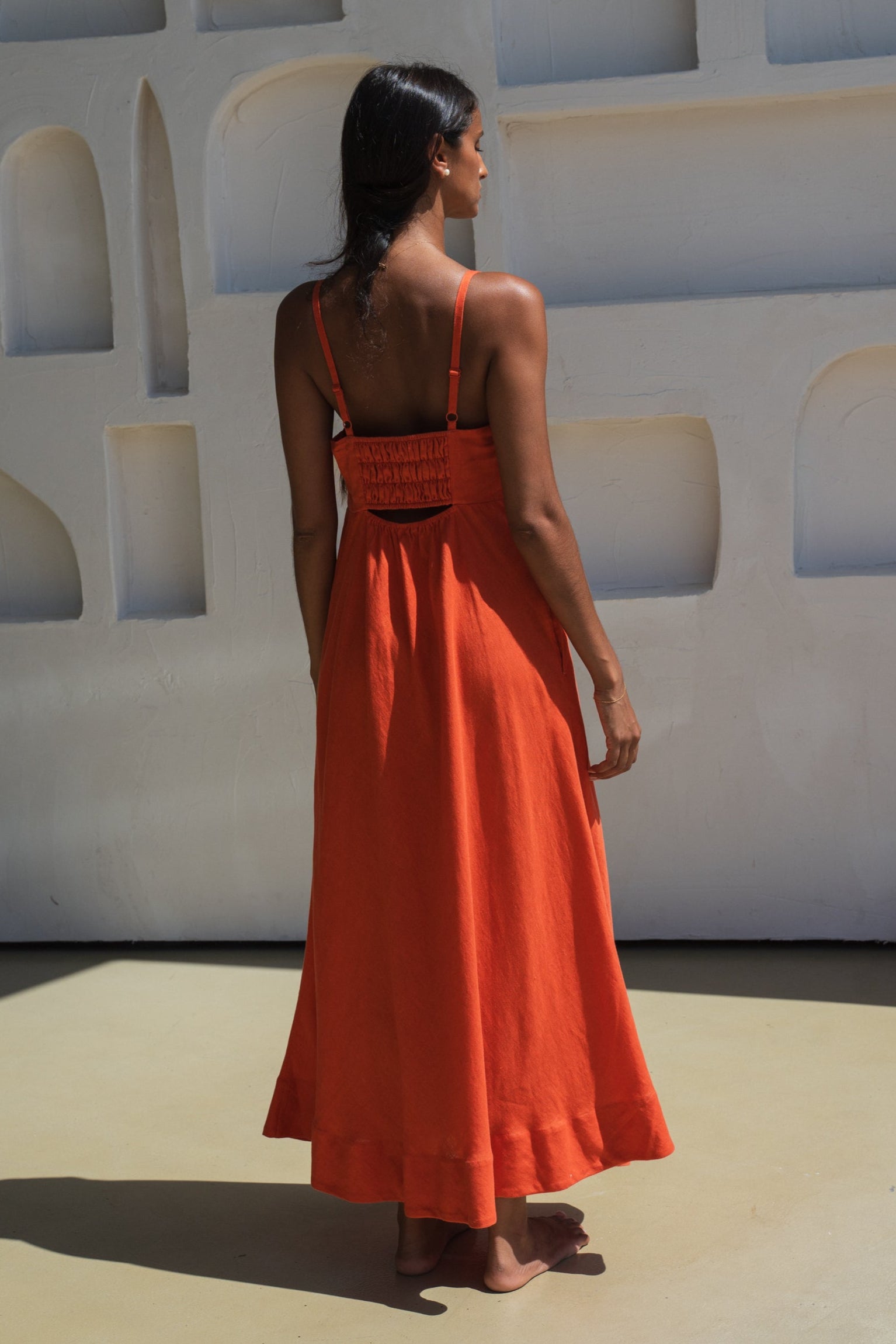 Our KIKO Linen Dress is an effortlessly chic bias-cut midi dress designed to flatter every shape. Made from 100% EUROPEAN FLAX® certified linen, she features an empire neckline with a soft draped overlay for a touch of understated elegance. Adjustable shoulder straps and an elasticated back neckline with a subtle cut-out ensure a perfect, bra-friendly fit, while seam pockets and French seams add thoughtful details. True to size, petite-friendly, and ready to become your new wardrobe staple.